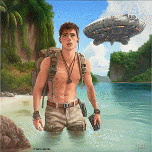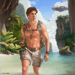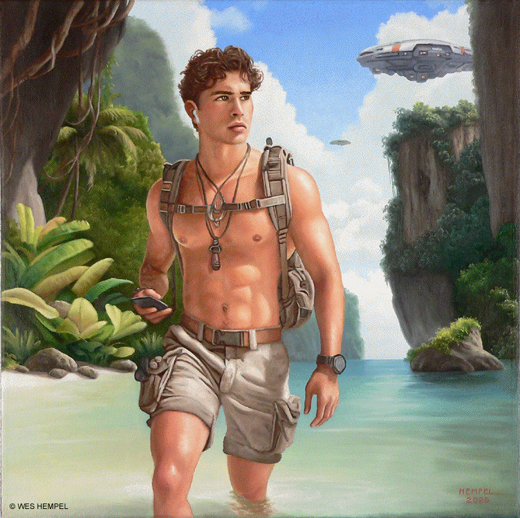 These paintings of imaginary film stills are based on a screenplay for a Science Fiction film, titled Regression, that an uncle of mine developed in the 1950s. The film was never made, nor, to my knowledge, has any of the script survived, but from memory I've tried to recreate what actual scenes may have looked like had the film been made. From what I remember of my uncle's stories, the script was about a crew of astronauts who travel to a tropical exoplanet that has an earth-like atmosphere. They begin exploring the surface in pairs but almost immediately get separated and lose contact with each other and with the ship. Isolated, they begin to reverse in age. It takes some time for them to notice, but they're growing younger at alarming rates. They wade in the shallows of coves, discovering that something in the water slows the regression process. Their ship sometimes reappears in the sky, but oddly in differing forms, as if something's trying to replicate it but can't get it right. Later it's revealed that the planet itself is a sentient life form that is purposefully regressing them. It senses dishonesty and aggression in them (elements fleshed out in earlier subplots) and can only communicate with minds that are free of guile. By returning them to their more innocent boyhoods, it hopes to establish contact. Wes Hempel ______________
